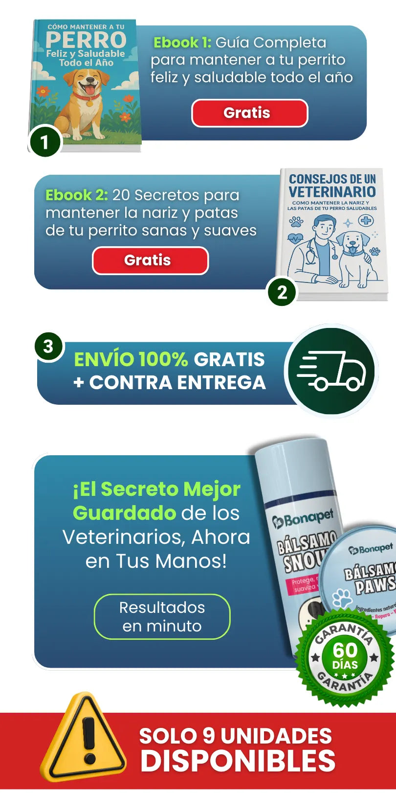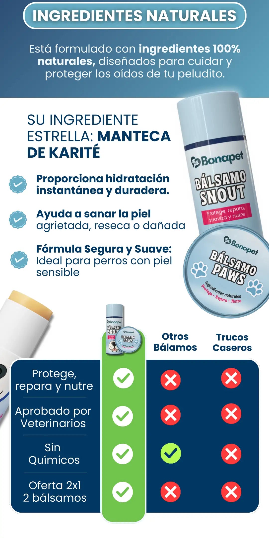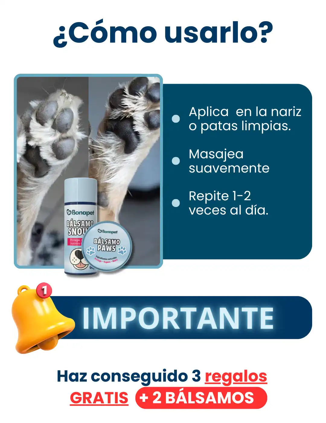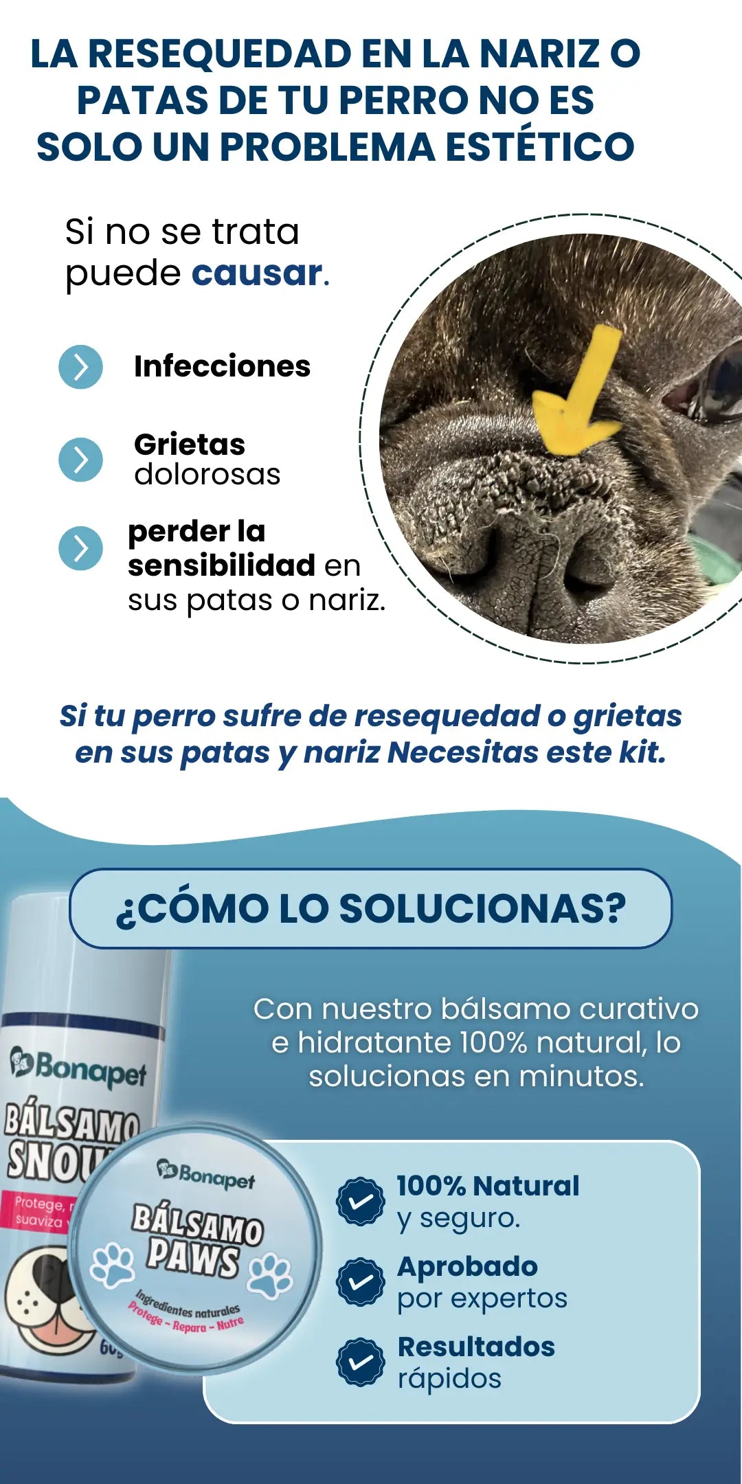 El Kit de Bonapet Bálsamo está diseñado para resolver dos problemas comunes de cuidado canino: resequedad, grietas e irritaciones en la nariz y sequedad, agrietamiento y dolor en las patas de tu perro.