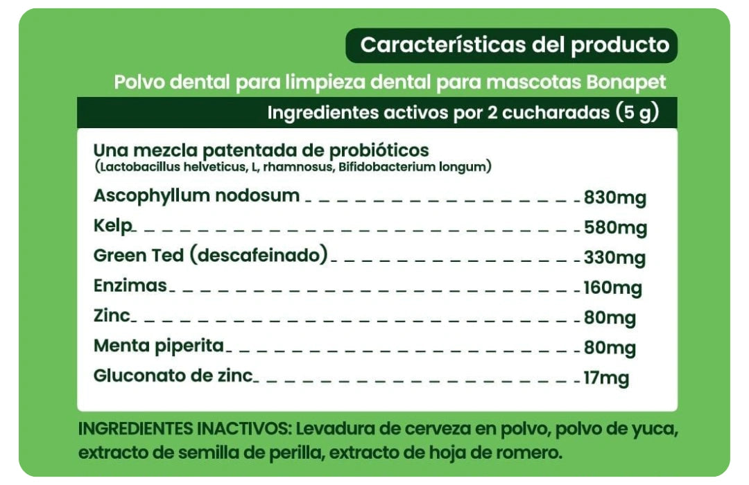 El producto contiene una mezcla de probióticos patentados, algas pardas, hexametafosfato de sodio y extracto de romero, todos ellos formulados específicamente para mejorar la salud dental de tu perro de manera natural.