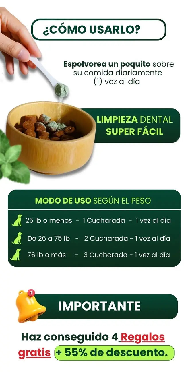 ¡No te preocupes! Nuestro producto tiene un delicioso sabor a hígado de pollo que a casi todos los perros les encanta. Se mezcla con la comida y ellos lo disfrutan sin problema. ¡Es una forma fácil de cuidar sus dientes y aliento!