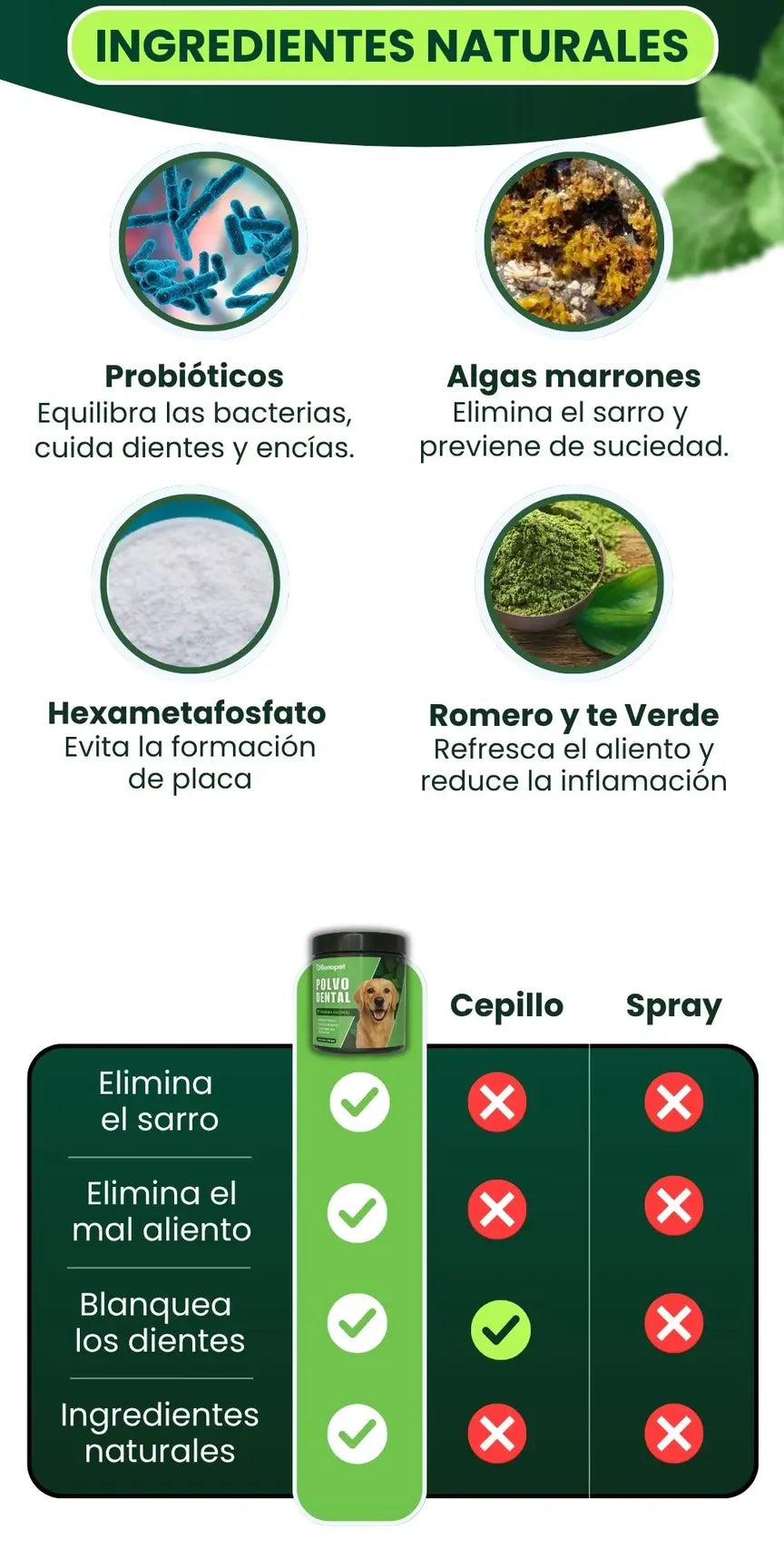 Nuestro polvo dental para perros aprovecha los beneficios naturales de ingredientes como las algas pardas y el té verde para reducir la acumulación de sarro y favorecer la salud de las encías. El extracto de hoja de romero y los probióticos contribuyen a un microbioma bucal equilibrado, garantizando la limpieza dental y el aliento fresco de su perro.
