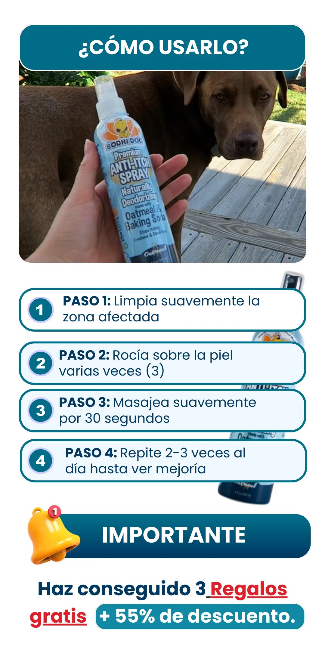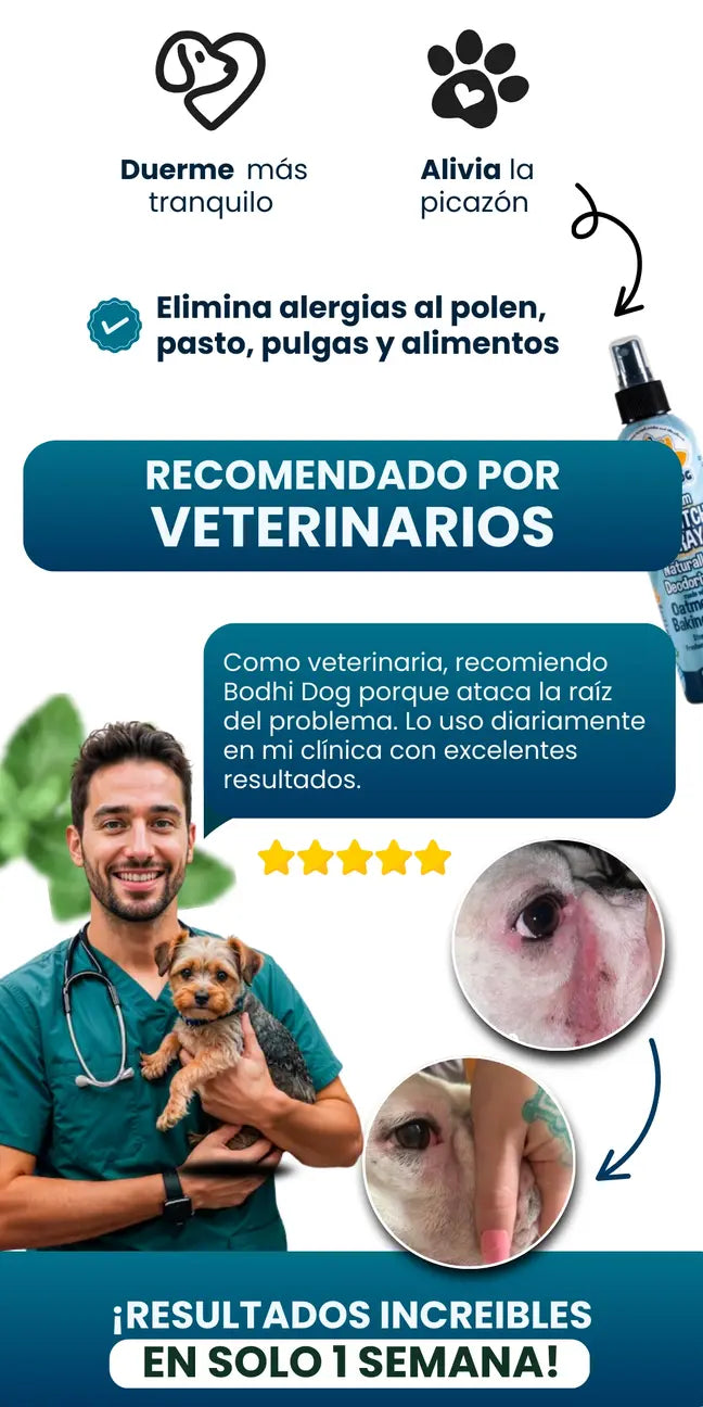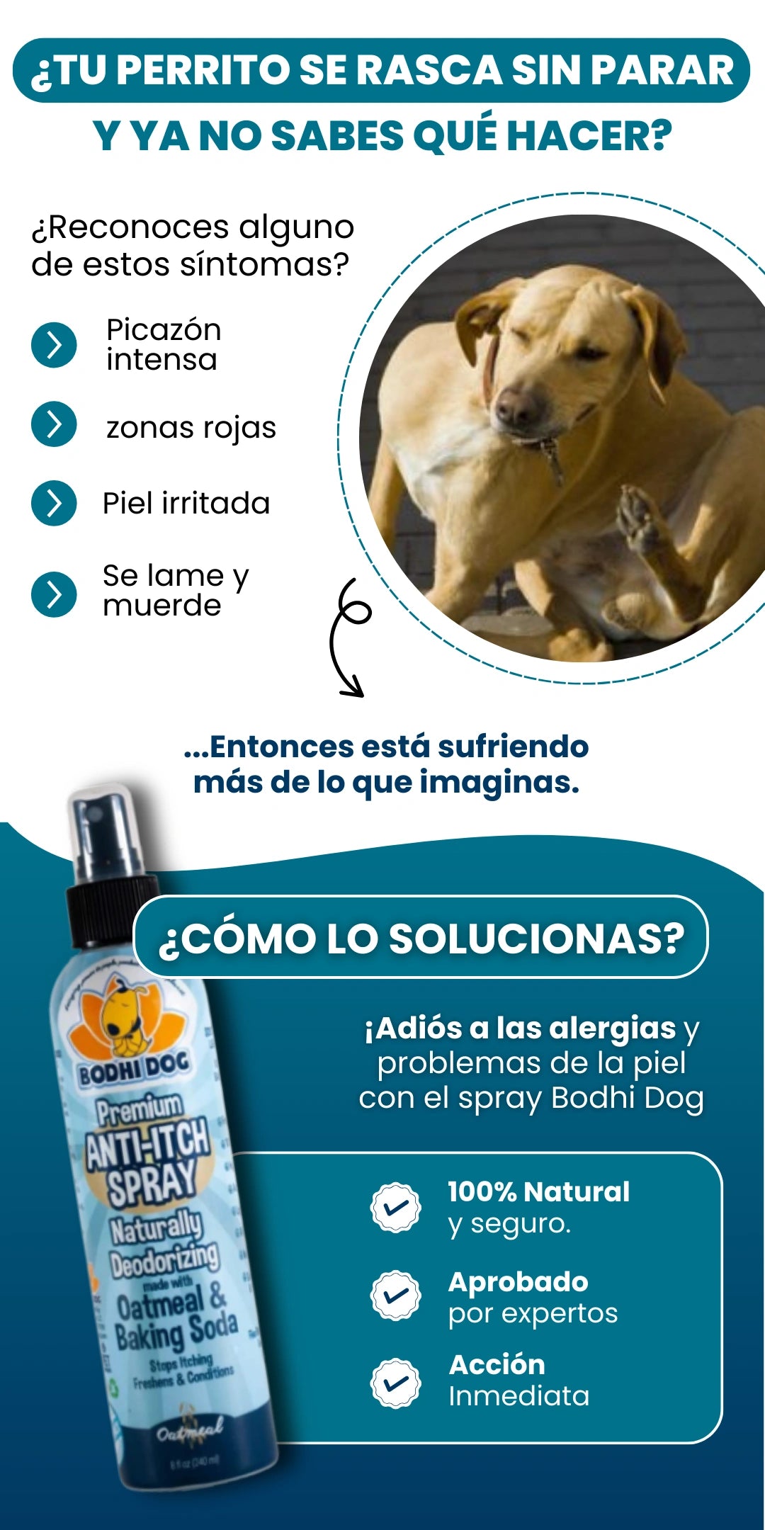 Trata puntos calientes, alergias a la hierba, alergias al polen, alergias alimentarias, alergias por pulgas irritación en la piel, arañazos y picazón constante. Además sirve para hongos y demás problemas en la piel.